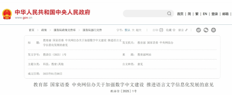 1月8日,教育部、国家语委、中央网信办印发《关于加强数字中文建设 推进语言文字信息化发展的意见》,首次提出“数字中文”概念。《意见》分段明确到2027年和2035年的发展目标,提出完善规范标准体系、健全资源服务体系、建强人才培养体系、构建协同创新体系、强化安全保障体系等建设任务;要求实施数字中文服务教育发展、助力科技创新、赋能文化传承、推动产业升级、促进社会进步等赋能行动。3月31日,教育部召开新闻发布会,提出以加快数字中文建设为重点,全方位释放语言文字的数据要素价值、全环节发挥语言文字的资源功能作用、全领域推进语言文字服务经济社会发展,助力提升中文在全球数字空间、网络空间和人工智能应用场景中的使用占比、价值引领和文化贡献。6月8日,《光明日报》发表《加强数字中文建设,全方位释放中文要素价值》文章,精准阐释“数字中文”内涵,系统构建数字中文建设政策体系和研究体系框架。